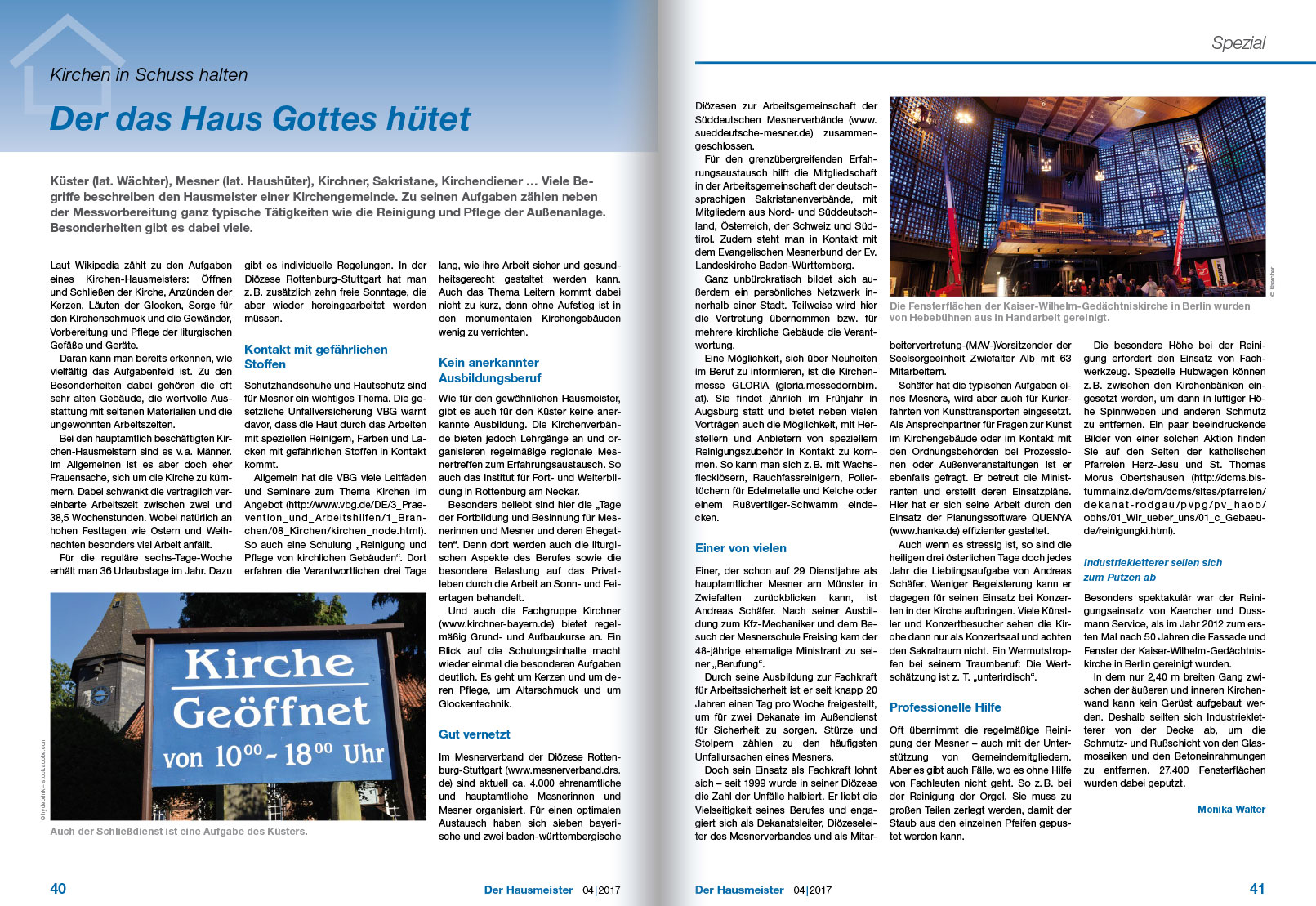 Bei den hauptamtlich beschäftigten Kirchen-Hausmeistern sind es v. a. Männer. Im Allgemeinen ist es aber doch eher Frauensache, sich um die Kirche zu kümmern. Dabei schwankt die vertraglich vereinbarte Arbeitszeit zwischen zwei und 38,5 Wochenstunden. Wobei natürlich an hohen Festtagen wie Ostern und Weihnachten besonders viel Arbeit anfällt.