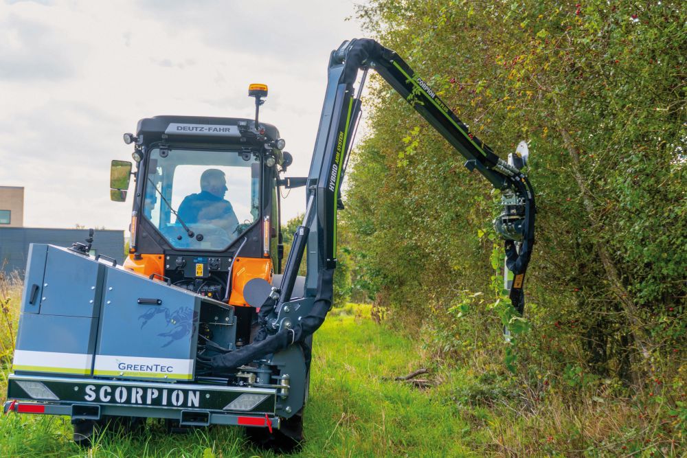 Zur Agritechnica erweiterte der dänische Hersteller von Profi-Maschinen für die Landschaftspflege GreenTec seine kompakte Ausleger-Baureihe um das neue Modell Scorpion 490 PLUS. Für die Leistungsstärke sorgt laut Presseinformation ein neues Hydrauliksystem. Der eingesetzte Danfoss-Prof1-Joystick sichert zusammen mit der optionalen automatischen Höhenkontrolle (AHC) das Handling und ein präziseres Mähen. Der Ausleger verfügt über eine Reichweite von 4,9 m bei einem Eigengewicht ohne Anbaugeräte von 700 kg. Dieses geringere Eigengewicht wurde konstruktiv durch den Einsatz hochfesten Stahls erreicht. Der Traktor als Trägerfahrzeug sollte für den Einsatz ein Eigengewicht von mindestens 2.500 kg besitzen. Seine Stärken erfülle das Modell bei Arbeiten auf engem Raum, wenn für den effizienten Arbeitseinsatz eine größere Reichweite des Auslegers benötigt wird.