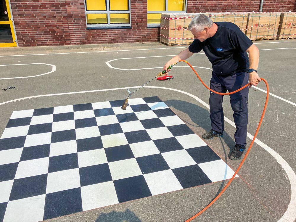 Schulhöfe sind weit mehr als reine Aufenthaltsflächen. Sie sind Spiel- und Lernräume, Bewegungszonen und Treffpunkte, an denen Kinder sich orientieren und sicher bewegen müssen. Gerade hier gilt es, Sicherheit und Spielfreude miteinander zu verbinden. Wie eine solche Verbindung gelingen kann, zeigt die Michael-Ende-Schule im Mindener Stadtteil Hahlen. Dort wurde der Außenbereich mit Markierungssystemen vom Flüssigkunststoffspezialisten Triflex grundlegend neu gestaltet. Mit Triflex Preco Line 300 und Triflex Line EasyTherm sind klare Wegeführungen, sichere Querungen und kindgerechte Spielflächen entstanden. Nach der Reinigung des Untergrunds wird Triflex einfach angemischt und je nach Fläche maschinell oder mit der Rolle aufgetragen. Die schnelle Trocknung sorgt für kurze Sperrzeiten und macht eine zügige Wiederfreigabe der Flächen möglich.